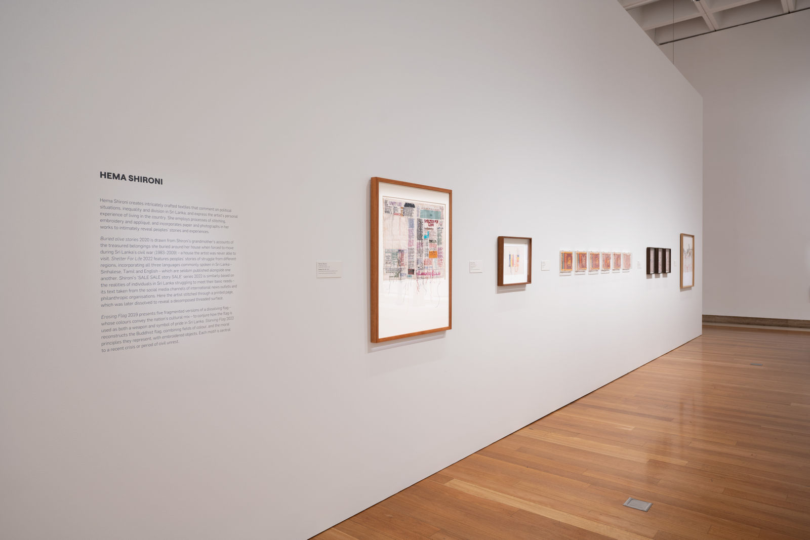 "The artist considers the politicisation of language and the travesties of inequality and injustice to be subjects requiring deep and necessary interrogation. Shelter For Life (2020) takes the form of a fabric newspaper arranged around minutely stitched cartouches of text. Created over several months, it features 30 accounts of people from different regions of Sri Lanka describing experiences of suffering and hardship. Significantly, the work features the three languages commonly spoken in Sri Lanka - Sinhala, Tamil and English - that are seldom co-published in the press."