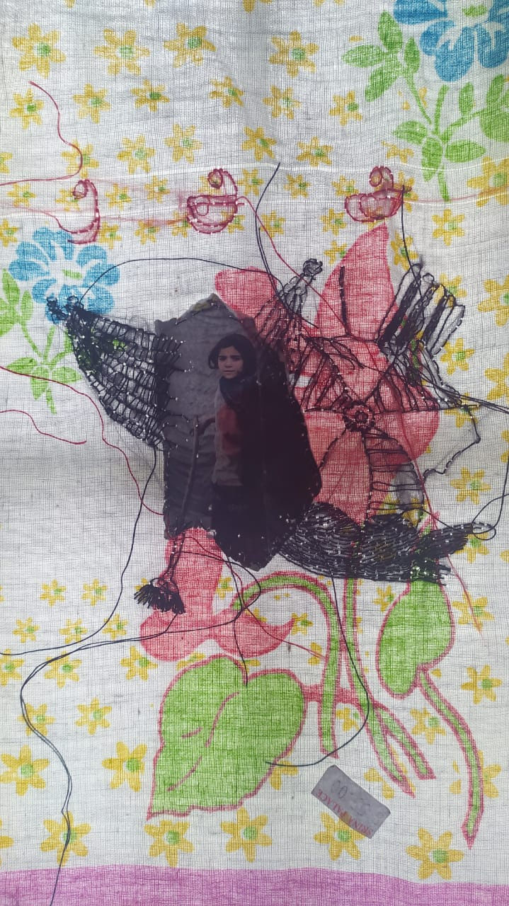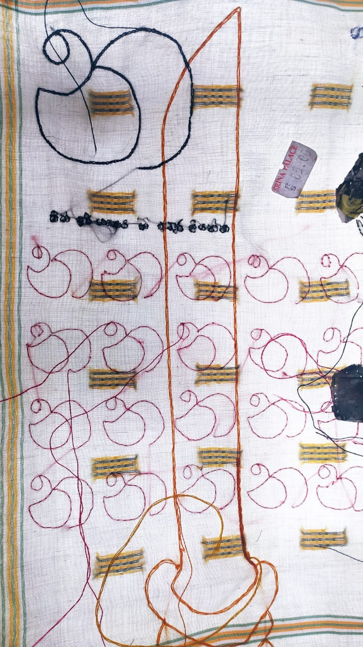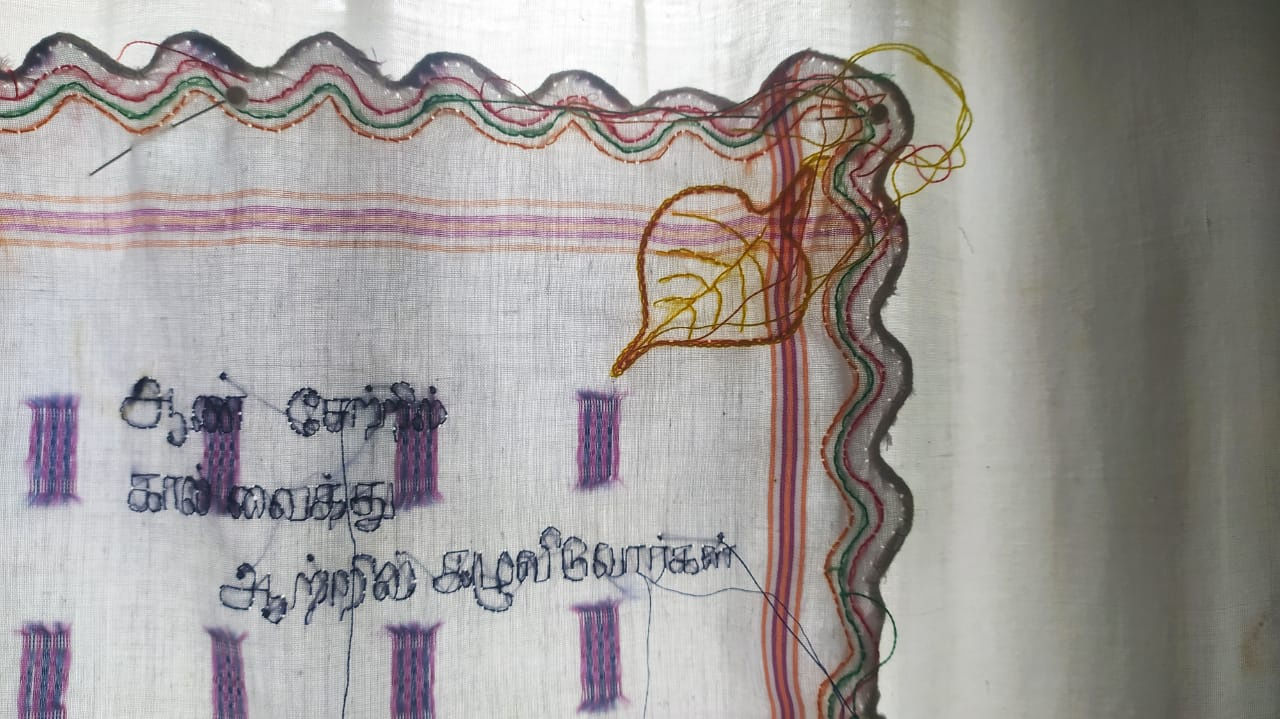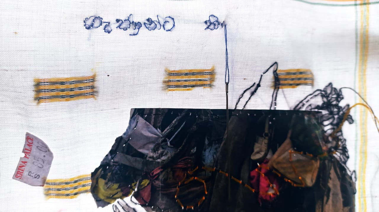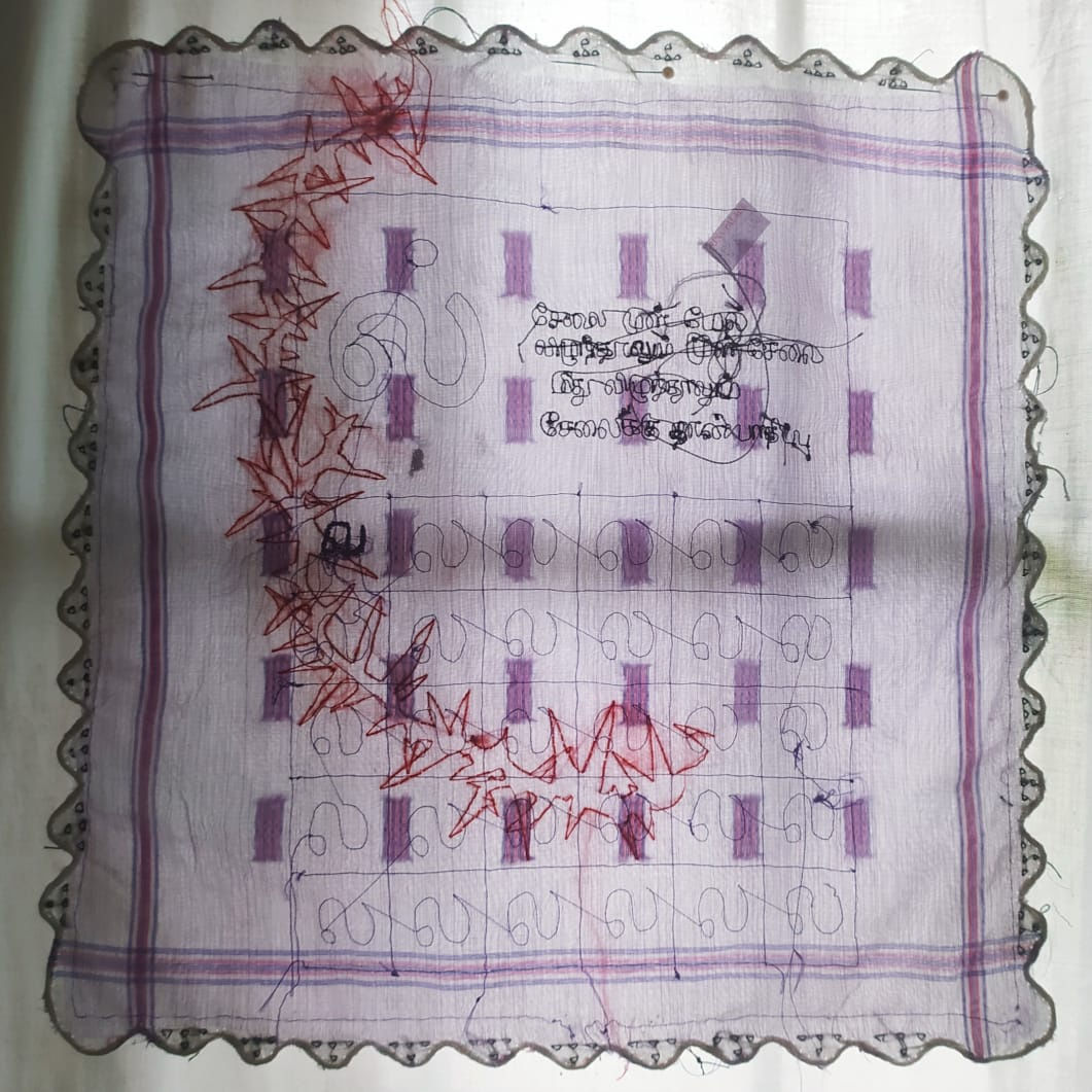 "The crafts produced and used by women from the past in the domestic interior are worth investigating to explain why women at various levels of society took up home crafts and their motives for doing in their life. At one level, it may have been artistic self-expression; at another level, the product of a commitment to household duty or financial necessity; on a third level, it may have been for entertainment or passing time, most of the time, the crafts were associated with women's lifestyle, these motivations seem to reflect recent past art forms too. The fields of art and crafts led to the difference between amateur women and professional men, especially, the equating of specific crafts women's work and homemaking. This gendering, visual sensibility women had developed was particularly directed towards their homes. Sabeen and I are more interested in the drive of craft in art through this collaboration. We were shared our opinions to build a path for the productions, interestingly, we both have an attachment with fabric to explore our emotions, while we discussed our practice got an idea from our personal use of the handkerchief, the use of them is slightly different from each of us but almost there are many memories are travelling through this small pieces of fabric. Used them as a messenger to carry the Relationship with grandmother, friends, family, schoolmates, loved ones and many others. I choose several handkerchiefs to develop the storylines and images that are more connected to my memory as a girl child, the verbal barriers used by my surrounding people to safeguard me from many situations. The meanings of the terms are raw and sometimes disgusting to hear, but they are passed from generation to generation. I collected some of them and shared them with Sabeen to improve as a visual language. Local terms are used as a cultural tool for driving a girl. I stitched and decorated them with visual meaning in the teaching and learning format of the alphabet to create a collective story as a reaction.