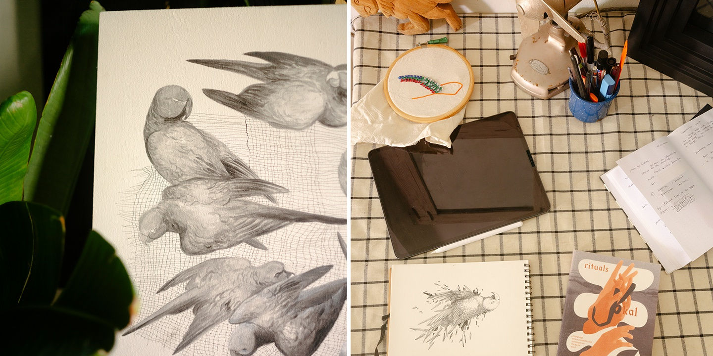 I usually wake up quite early and get started on my work. The day depends on my mood and motivation. When there is an artwork, I’m eager to finish and I have motivation, I will work on it continuously. I will take a break for lunch and dinner and I might take a small break to have a nap. This has been my recent routine. On other days when I know that I have time to work on my art I will stick to my own deadlines. So, for example if I’m drawing a bird, I will concentrate on finishing one part of the bird. It might take a few hours or an entire day. I will keep working until it is finished. It depends on the deadline I give myself. Recently I have been quite busy so I have been working continuously.