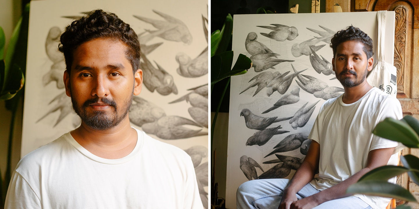 Firi Rahman’s work is often concerned with the contentious relationship between humankind and the animal kingdom. He is particularly interested in the interactions between animals and urban environments, and the responsibility societies share in protecting biodiversity. His works, brought to life through his sombre and monochromatic style, are an intimate and sensitive engagement with wildlife. Even in their minimalism, the dexterity of his skill and close engagement with the subject imbues it with a palpable quality — compelling an empathetic response from the viewer. Firi earned a Foundation in Art and Design (2012) from City and Guilds at Manchester College in the United Kingdom. He is a cofounder of We Are From Here, a collective project which highlights a deeply interconnected community in Slave Island whose home-base is increasingly threatened by gentrification for state and corporate interests. Firi’s work has been exhibited at the Colombo Art Biennale (2016), and Colomboscope (2016 and 2019). His works belong to private collections in Sri Lanka, Switzerland, India, United Kingdom, and the USA. He was also selected for the Cité Internationales des Arts residency in France (2023).