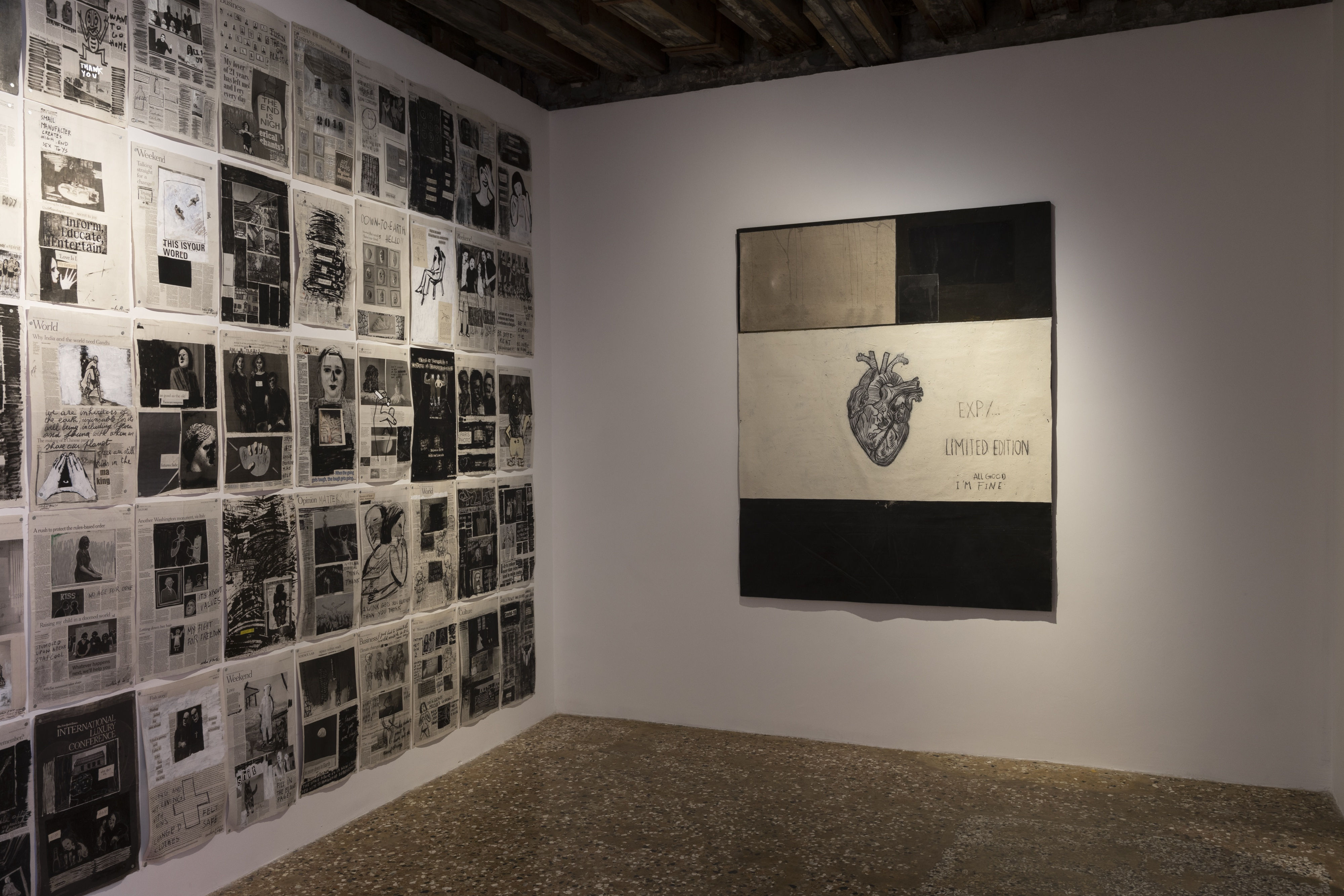 Saskia Pintelon presented Through The Eyes Of A Baby for the 59th Venice Biennale as part of the 'Personal Structures' exhibition. The installation included large scale works on canvas alongside a collection of drawings compiled of scratched-out text, and cut-outs placed over pages culled from newspapers. In keeping with the theme of the exhibition Pintelon attempted at a wilful distortion of traditional news stories, by channeling the news through the filter of her mind. Replete with saucy asides and irate outbursts known internally but seldom articulated, Through The Eyes Of A Baby, engaged the artist and the viewer in private outbursts, as they reflect on experiences of bewilderment and disbelief for events and people. |