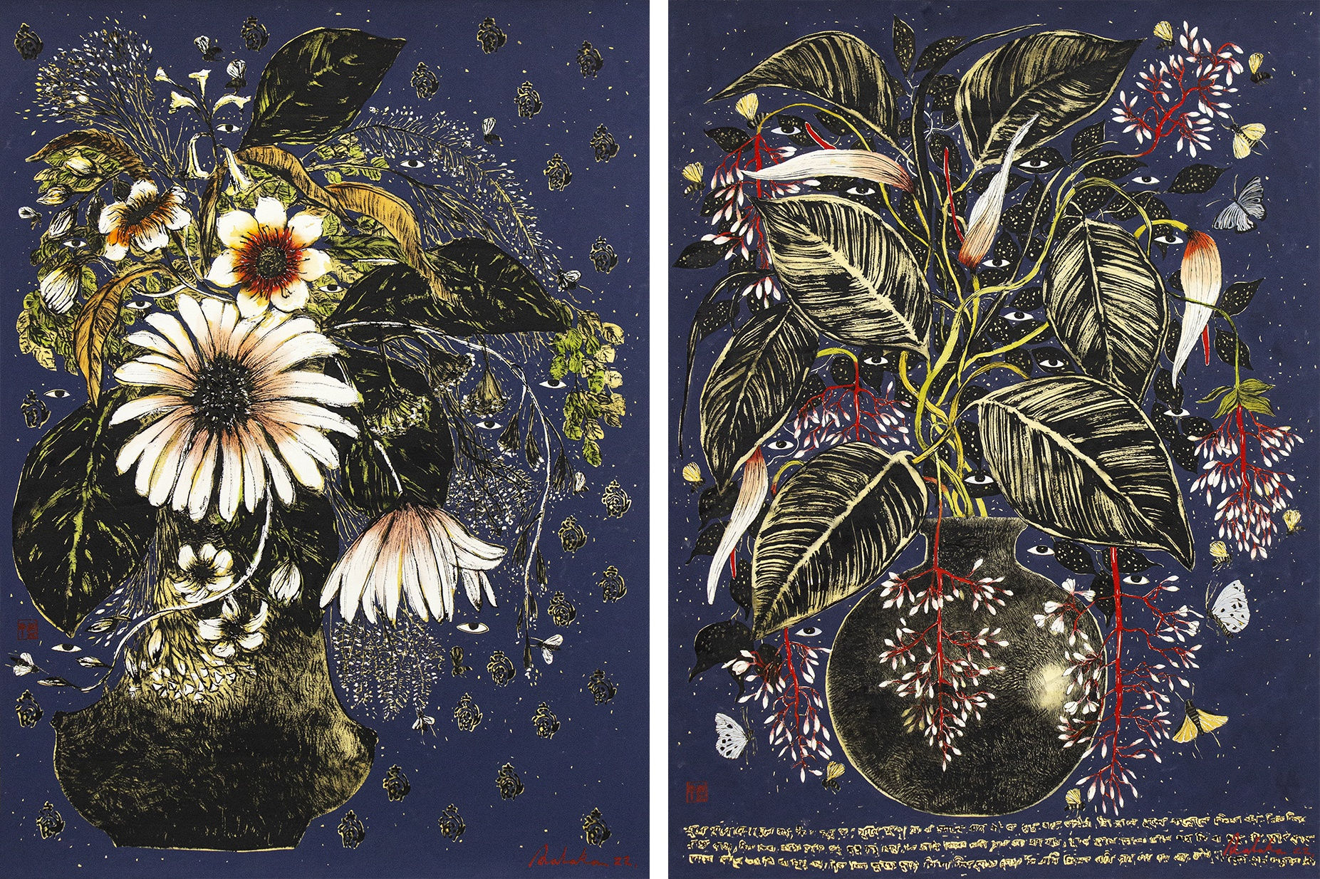 | Nuwan Nalaka, Prakriti VII & Prakriti VIII, 2022, Tempera on Fabriano paper, 76 x 56 cm |