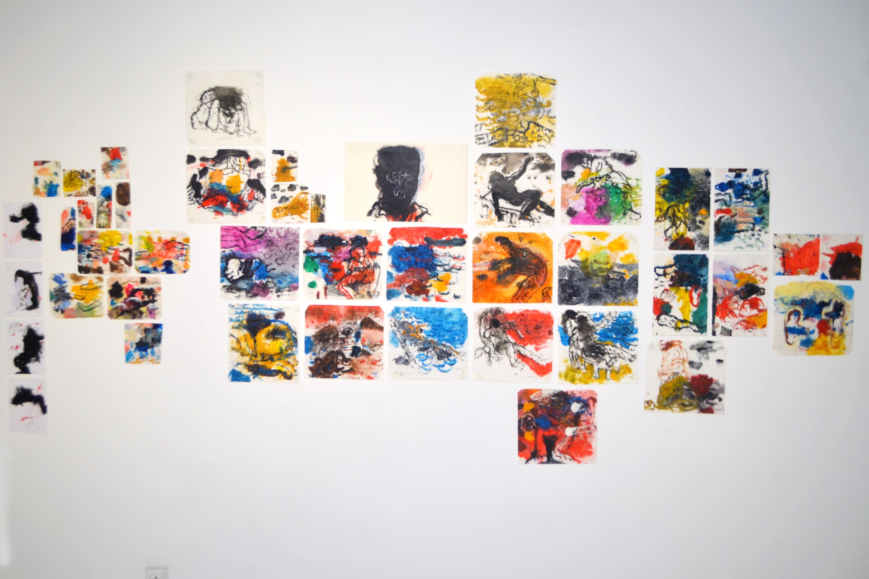 The lone figures of Arjuna Gunerathne’s Day to Day series reflect a private world of anxieties & vulnerabilities. This disquietude becomes visceral in the uncanny figures, manifesting in deformed heads and jagged and jutting limbs. Suspended in cloud-like formations the figures are sprawled out pensively and seemingly mired by their solitude. Stemming from the artist’ experience of migration and adapting to new environments, the pen on paper drawings reflect the ruptures in one’s sense of belonging that accompany prolonged loneliness.