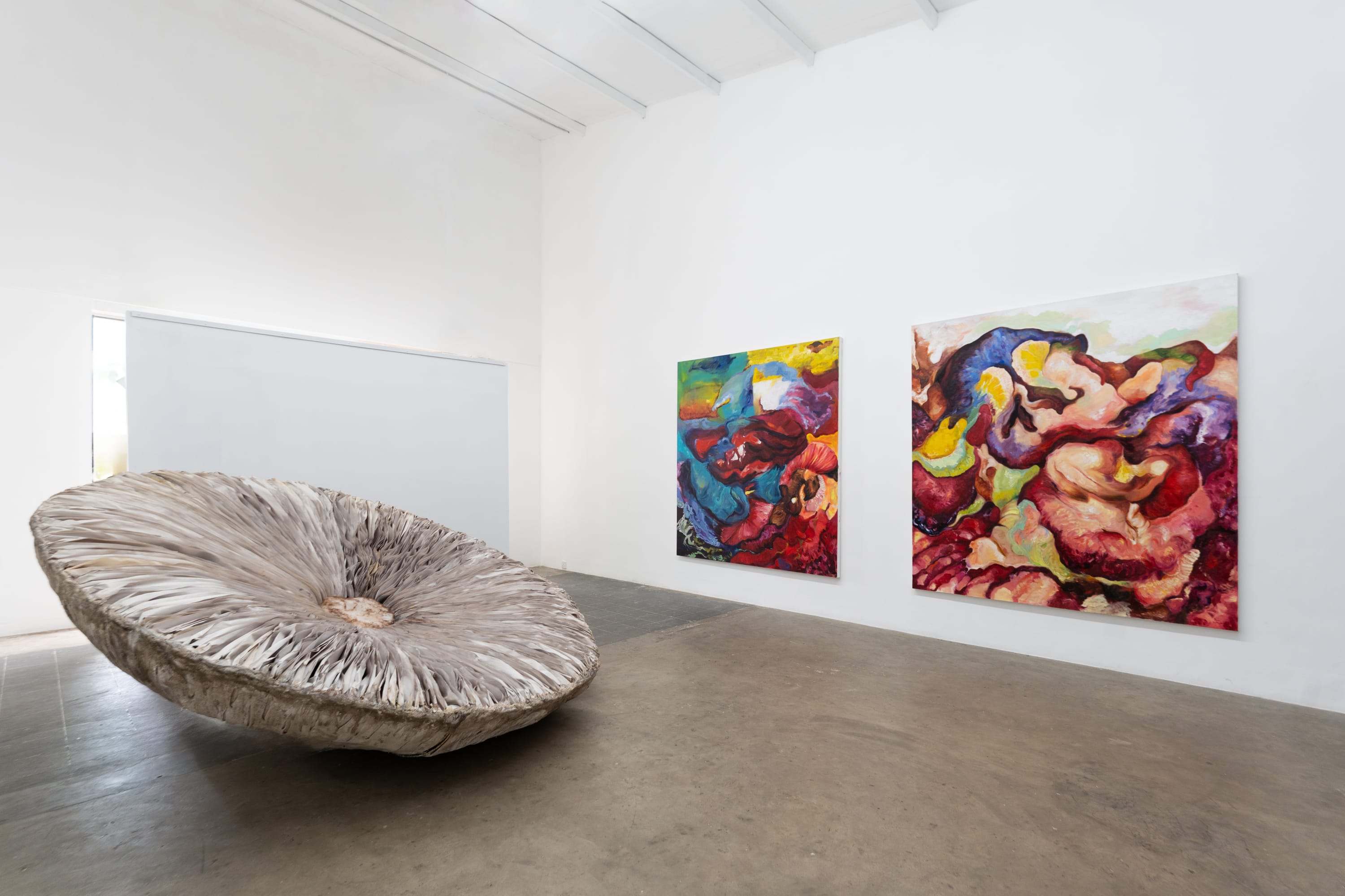 In ‘ Love Untethered’ delicate mediums are meticulously layered and structured, given a fleshy tactile quality that mirrors the dynamic nature of fungi and spores Illangasinghe studies. The installation responds to its environment and audience with quiet sensitivity as if an invisible transfer of matter and energy occurs as you weave through the space. Through her foray into abstraction and tactile engagement, Illangasinghe interrogates the cyclical exchanges of nature and the imperceptible links between life forms and the natural world.