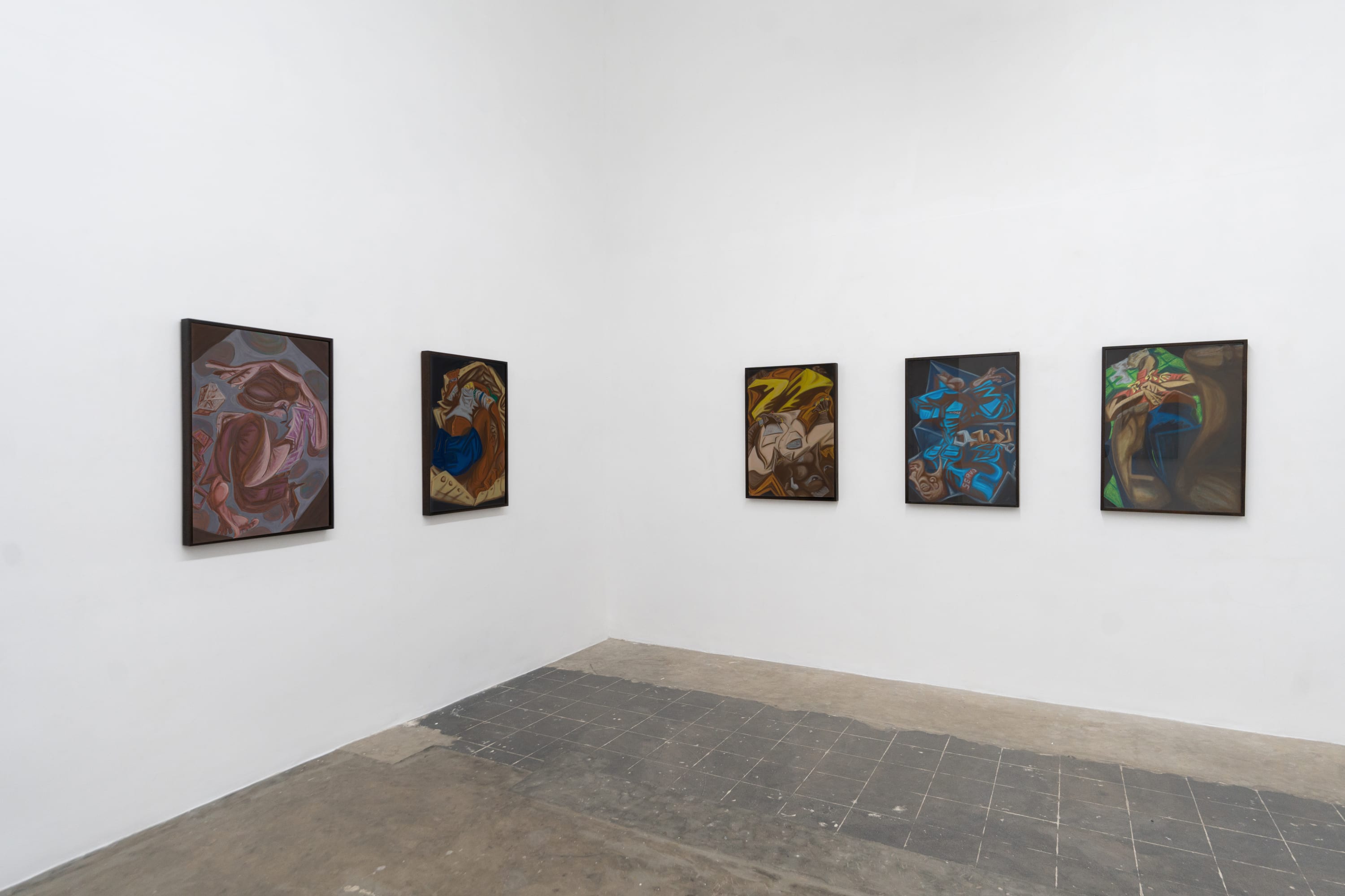 ‘Uniforms’ delve into the conditions of existence within a society and culture that demands a constant outpour of labor, where near-constant exhaustion prevails. Located within this tension is uniformity, enforced through the costumes the figures don as they perform their assigned roles. A dynamic colour palette is coupled with playful distortions that warp the dimensions of the canvas. Each figure appears trapped in their own cycle of perpetual motion, caught in a loop where work and rest blur into one another.